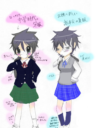 お久しぶりです・・・かね? はい。 別にまわされたわけでもないバトンです。 つまり、バトンではありません。 やってみたかった。 ただそれだけなので、特に最後に回すこともない。 がやります。 『制服バトン(だからバトンじゃない。)』 女装、つうか女体化。双子のある意味擬人化。で、別々に海燕体になってます。 注意してください! ちなみに、明日から二日は引きこもります。 勉強に集中すると思います。 では。 はい。制服大好きな人ですから。 ちなみに、ニロが中学校のとき、アロが高校のときです。 高校は私服高なのでいわゆる、なんちゃって制服です。 紺ソックスです。中学校は白ソックスです。 高校の1年成り立ての頃。友達に 「空一、君しか白ソックスの人いないよ・・・。」 と言われて紺ソックスになりました。 本当だ・・・!!怖!つうか恥ずかしい! アロの服は夏のときのです。 上がねずみ色のベストにワイシャツ。青いリボンに青いスカート。 某制服会社で買った服です。 でも、中学校の服のほうが実は好き。 いや、あまり絵で表せなかったけどめっちゃ可愛いんです! 本当です!(主観的意見) いや、 自分が中二のときに学校が統合して新しい制服になったんですけど、 本当は銀ボタンとかかっこいい模様があって かっこいいエンブレムみたいなのが胸らへんにあるんです! ・・・描くの・・・細かすぎて嫌。 ちなみに、中学校はかばんは自由でした。 今思うと半端な自由です。 高校、私服高なのでどんな服着ててもOKです。 ある子は白衣を着てました。 かっけええ! それで数学を受けているとかかっこいい。 でも、ザポは茶色のベストを着ていてほしい。 はい。 下になるほどどーでもいい内容ですが。 ニロとアロの擬人化?海燕体? まーそうゆうのです。 今回は『9』のマークは不釣合いなので消しました。 やっぱり、あの服でないと何事もバランスが取れないよ。 そうすると、よく考えられた服だ。 どの姿でも9倍男前になってるよ! そんな自分のかっこよさのために動きやすさをなくすなんて! もう!この大馬鹿者め!可愛すぎるんだよ!!! PR